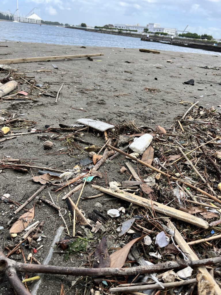 打ち寄せられた木々と多くのゴミ。ペットボトルはもちろん、割れたカップ麺の容器、ストロー、何かのキャップ、船のブイや切れた網、茶色い小瓶や傘の柄、靴、ちぎれた人工芝に小さいプラスチックの破片たち。原型をとどめている物から、少しずつ形が崩れ、小さな海洋プラスチックごみが砂浜にたくさん混ざっていました。
