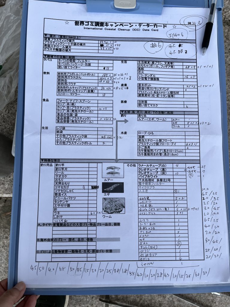 約2時間かけて回収したごみは、「海をつくる会」のみなさんと手分けして分類、計測が行われていきます。